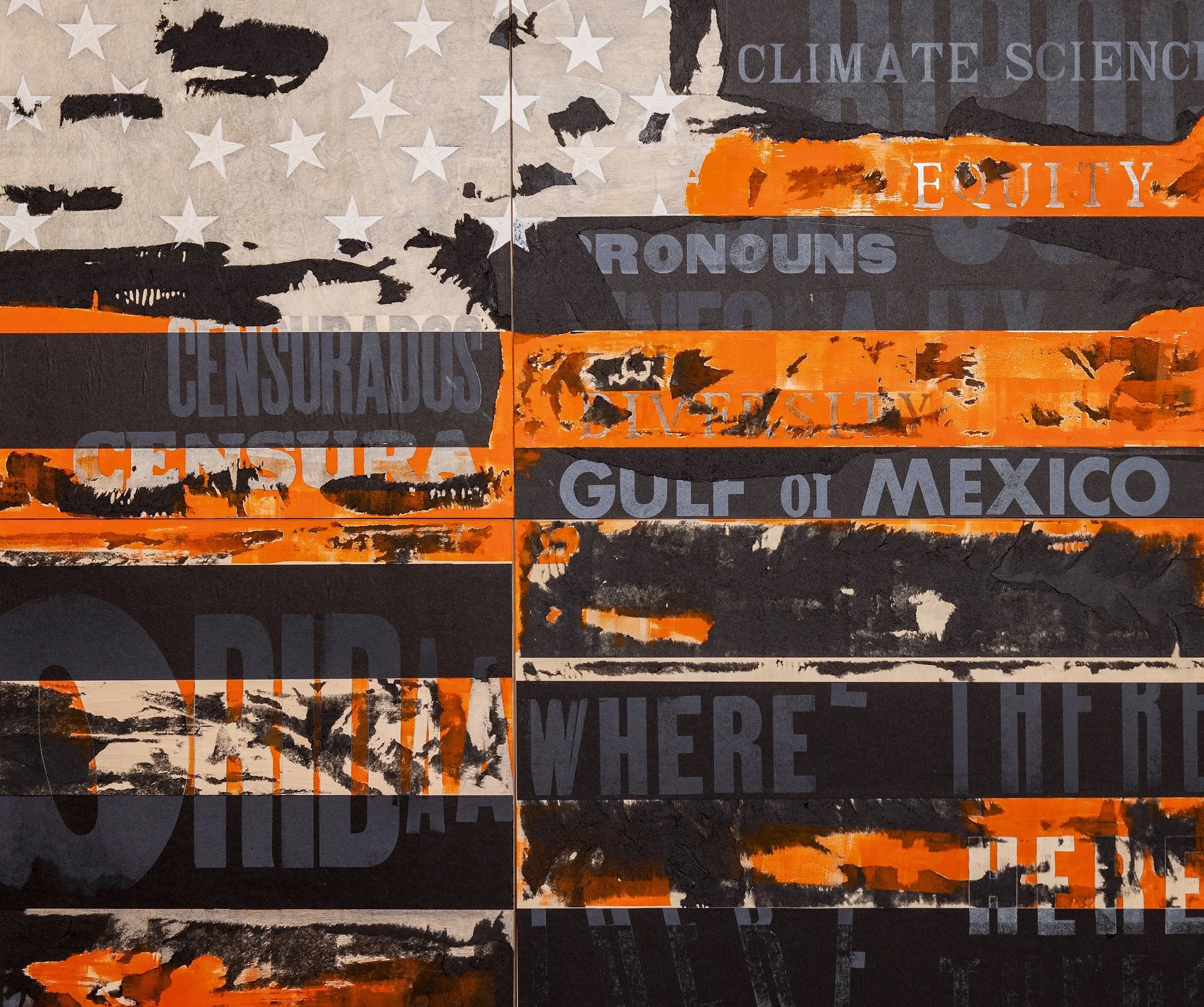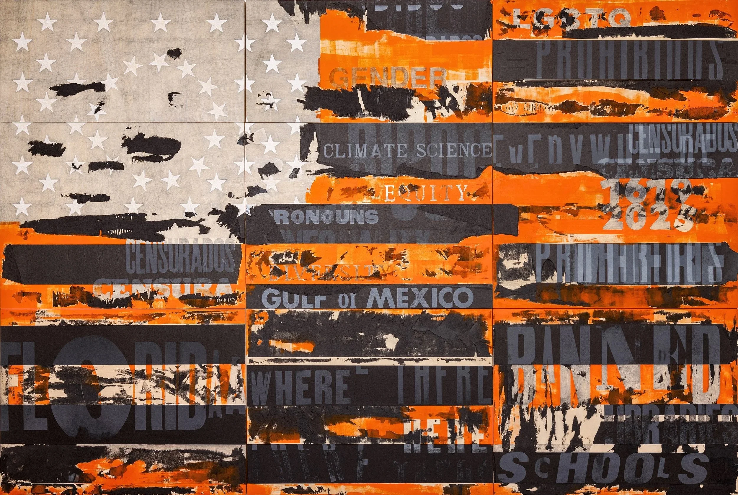 Flagged for Deletion builds on the legacy of artists such as Jasper Johns, Faith Ringgold, David Hammons, and Dread Scott, reimagining the American flag as both a contested symbol and a field of resistance. The title plays on the dual meaning of “flagging”—a signal of national identity and an act of erasure. Layers of ink, type, and fragmented words—censored, banned, gender, climate science, Gulf of Mexico—emerge and fade beneath scraped surfaces and overprinted bands. The work evokes a digital warning, as if the nation itself has been marked for deletion: histories redacted, voices silenced, truths overwritten. Through the handmade process of letterpress printing and drawing on wood, the piece transforms the mechanics of censorship into an act of witness, reclaiming the printed word as both evidence and resistance.
